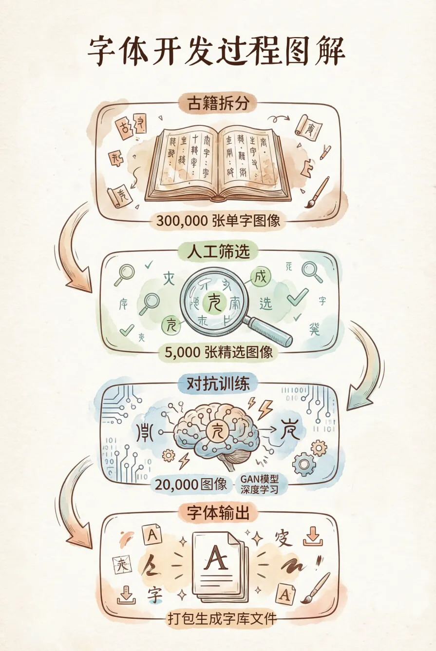 从古籍中拆分出30余万个字符图像,人工筛选出5000余个字符图像,然后将图像输入本地部署的模型进行对抗训练,最终输出为一个令人基本满意的字库文件。