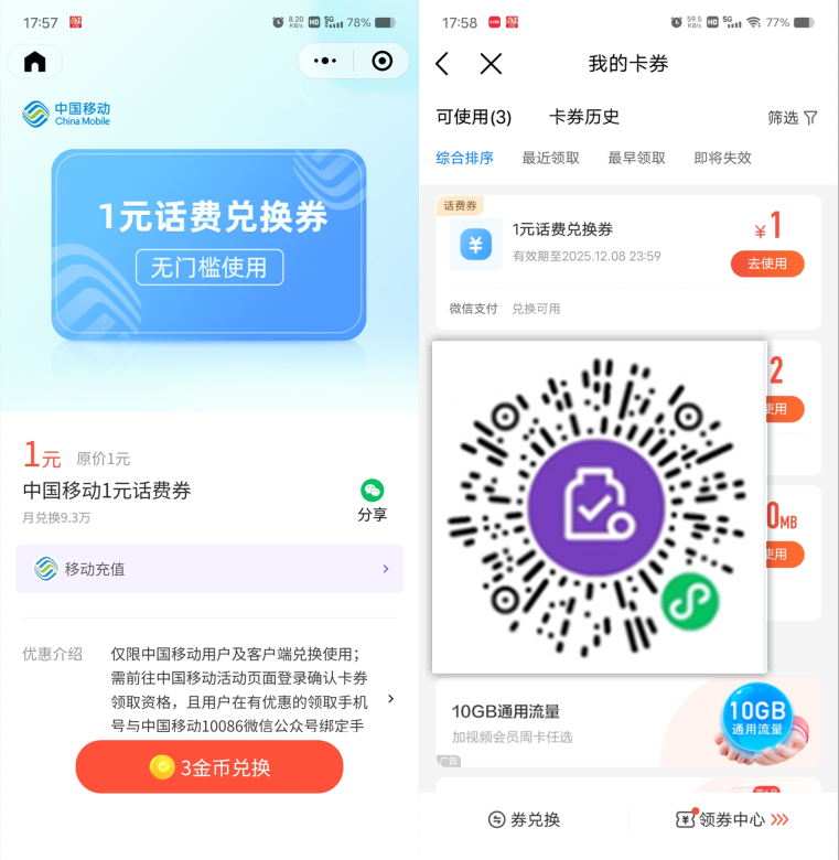 - 12-01 微信3金币兑换1元中国移动手机话费