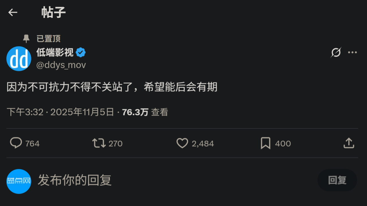 颇受爱好者们欢迎的在线影视资源站点「低端影视」目前已经宣布关停网站,其官方账号发布的消息称因为不可抗力因素不得不关站,通常来说此类影视资源站点主要都是版权类问题。