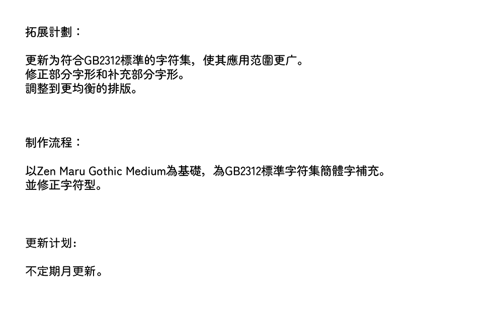 更新为符合GB2312標準的字符集,使其應用范圍更广。 修正部分字形和补充部分字形。 調整到更均衡的排版。