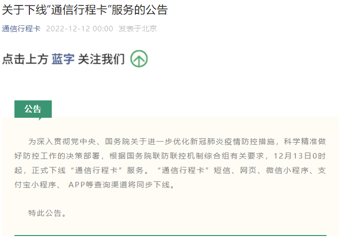 据通信行程卡官方消息,根据国务院联防联控机制综合组有关要求,12 月 13 日 0 时起,正式下线“通信行程卡”服务。“通信行程卡”短信、网页、微信小程序、支付宝小程序、 App 等查询渠道将同步下线。